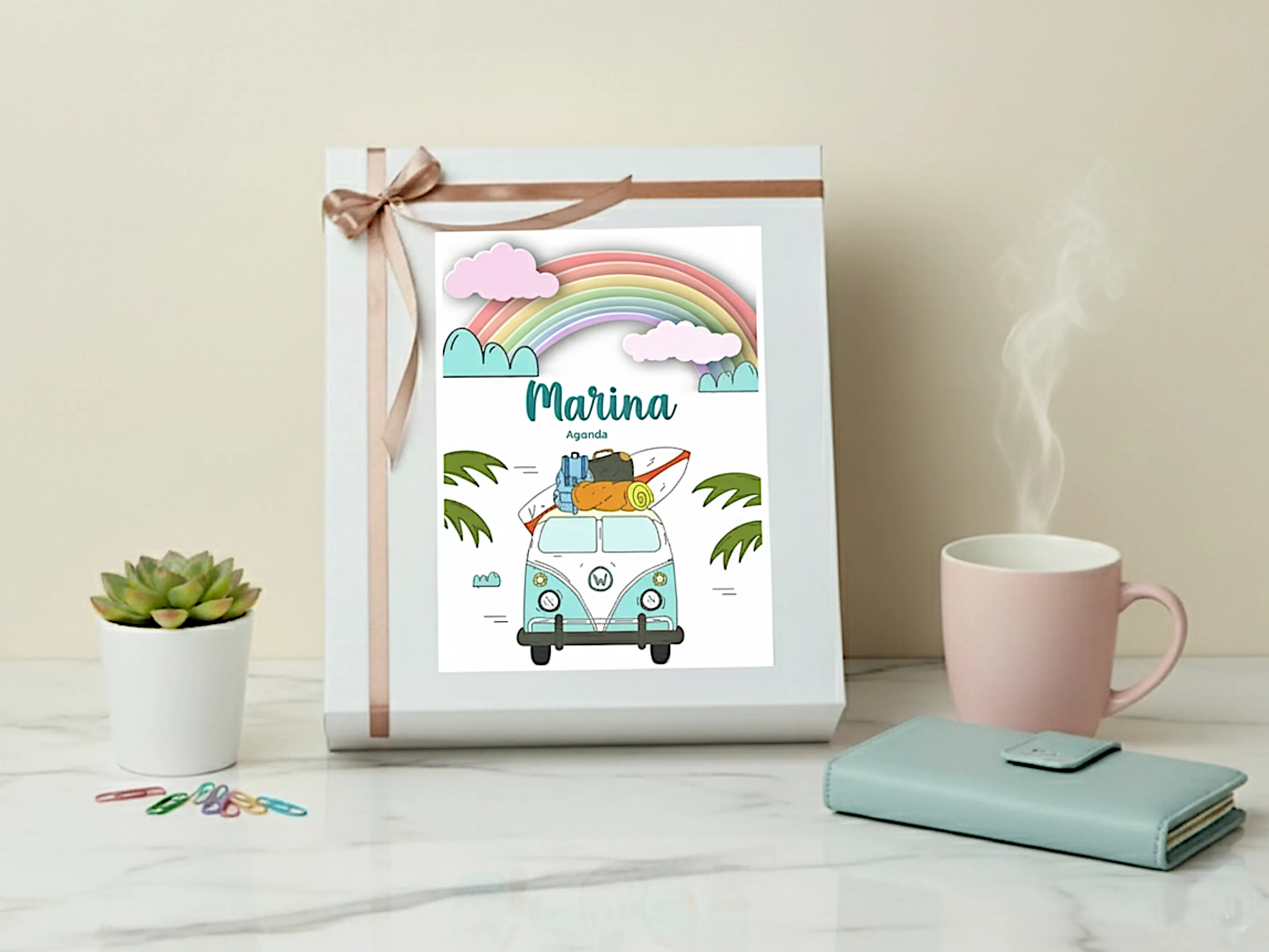 Una vez que tenga todos tus datos, te enviaré un documento PDF con la previsualización de todos los artículos que has elegido. En este PDF verás los diseños ya personalizados con tus nombres, fechas y toda la información que me hayas facilitado.