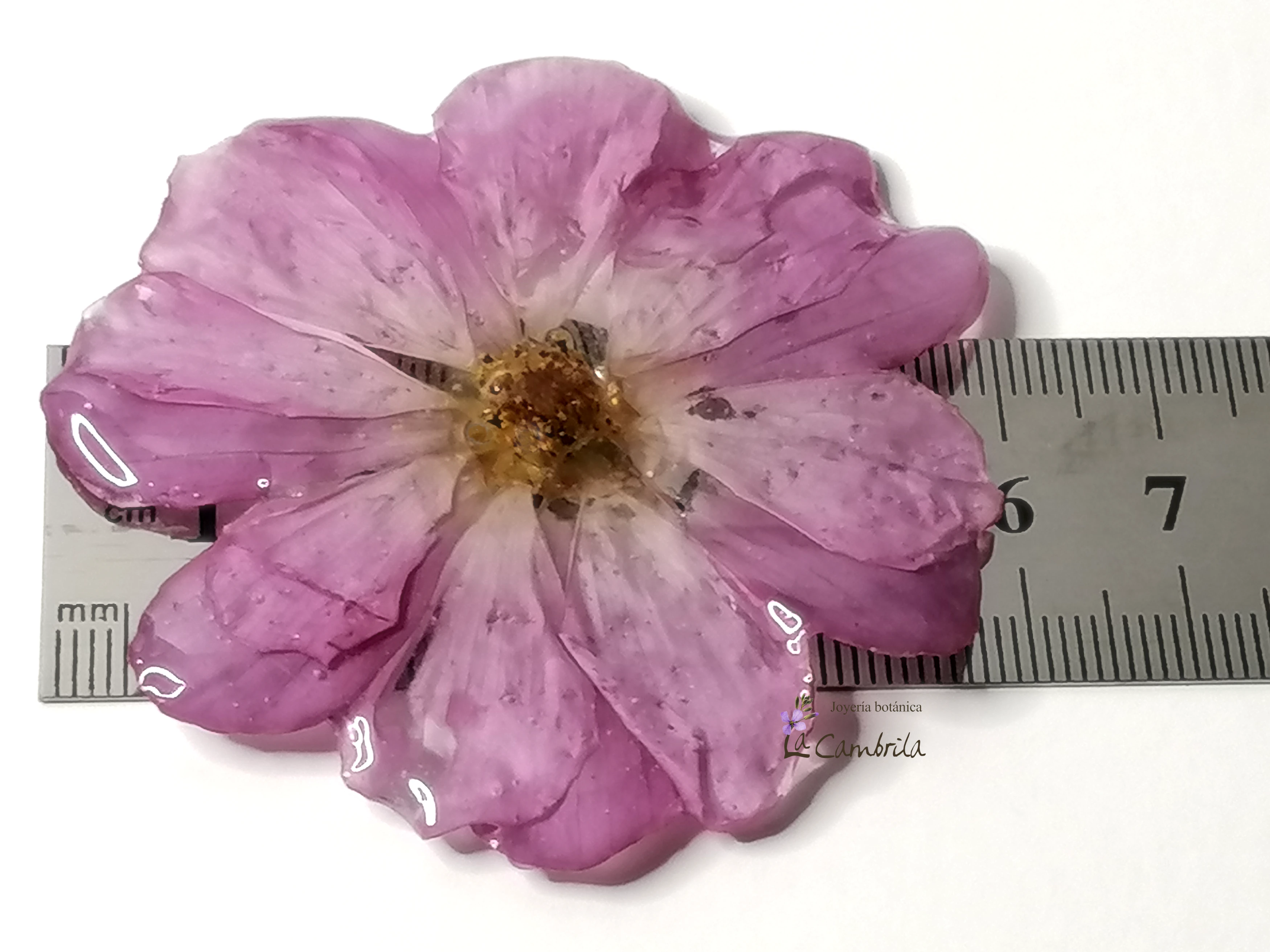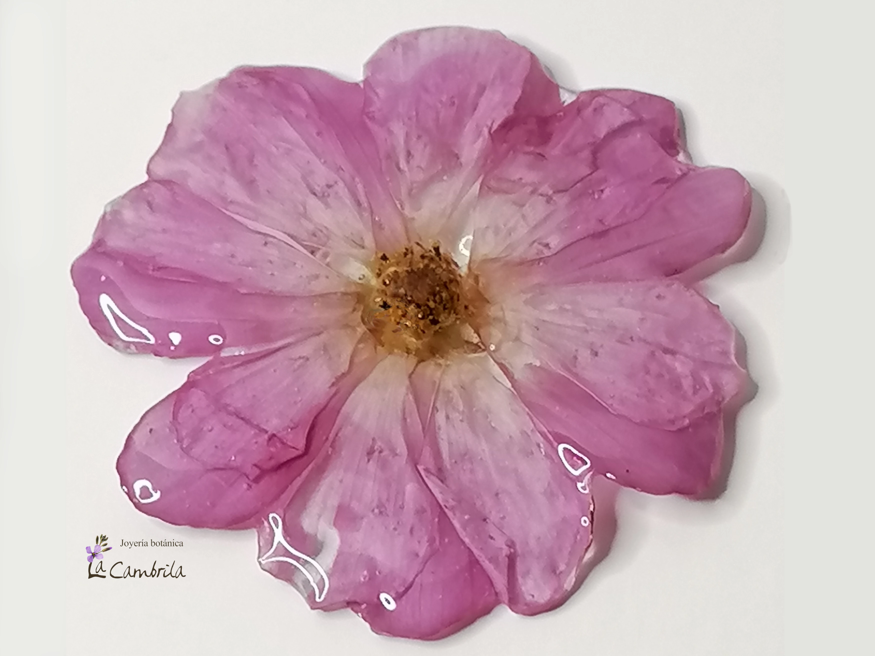 Una vez lista, la trato con todo mi mimo y la encapsulo en resina transparente. Esta capa de resina actúa como un cristal eterno que protege la delicadeza de los pétalos, permitiendo que puedas tocarla y lucirla sin miedo a que se estropee.