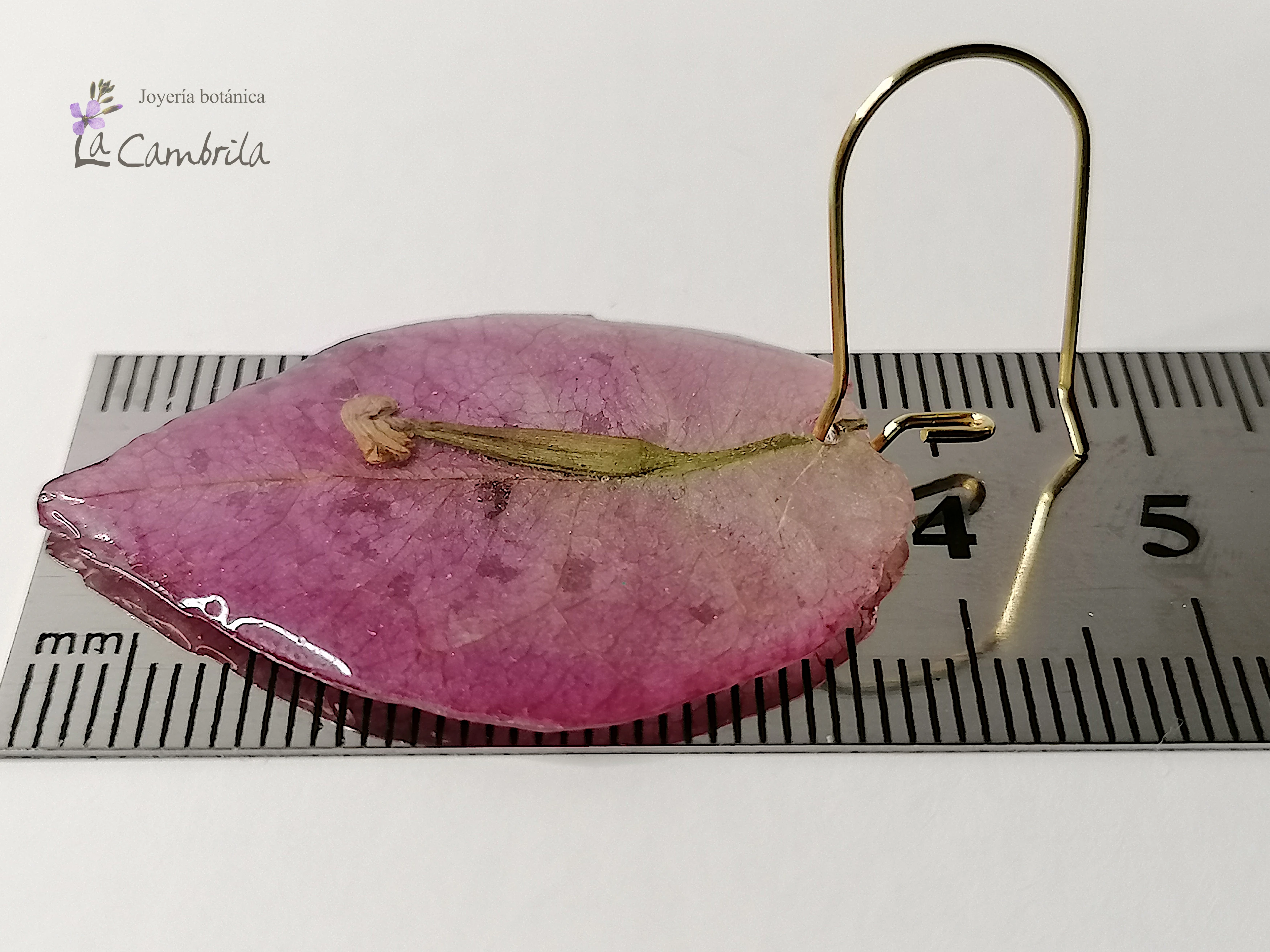 Crear estos pendientes es un proceso que requiere mucha delicadeza, ya que los pétalos (que técnicamente son brácteas) de la buganvilla son extremadamente finos y frágiles.
